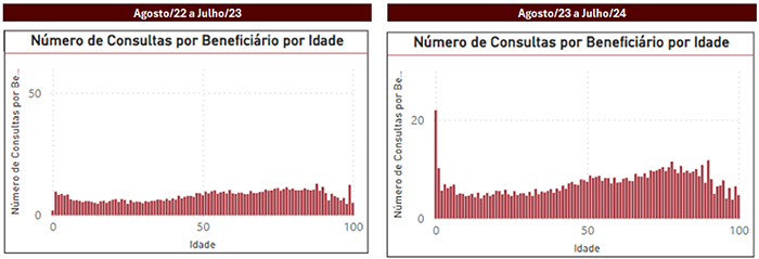 Apesar da redução do número de consultas realizadas por beneficiário, houve um acréscimo no custo médio, por consulta, de R$ 98,76 para R$109,99, representando um aumento de aproximadamente 11%. O gráfico a seguir apresenta a distribuição do número de consultas e exames laboratoriais feitos, por faixa etária, entre os meses de agosto de 2023 e julho de 2024. É possível observar que a redução no número de avaliações médicas por beneficiário não aconteceu de forma linear por faixa etária, e que o número de consultas na faixa dos que têm entre 0 e 1 ano se destaca em relação às demais.