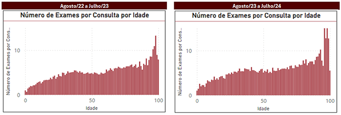 Os gráficos abaixo demonstram, ainda, o aumento do número de exames por consulta para beneficiários com 95 anos ou mais, em relação ao período anterior.